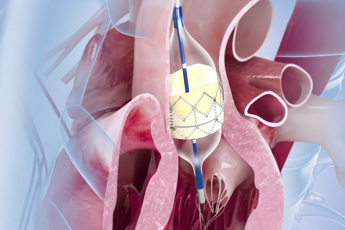 The new valve is then expanded inside the old, narrowed valve, restoring normal blood flow.